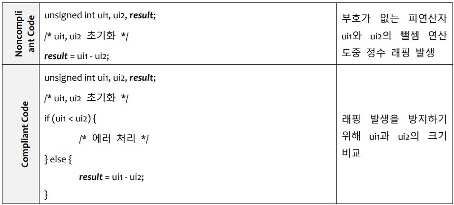 [부호없는 정수 연산 시 래핑 발생하지 않도록 보장하는 뺄셈연산 보안코딩 규칙 예시]