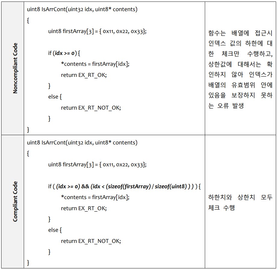 [배열이나 포인터 인덱스가 유효범위에 있음을 보장하는 보안코딩 규칙 예시]