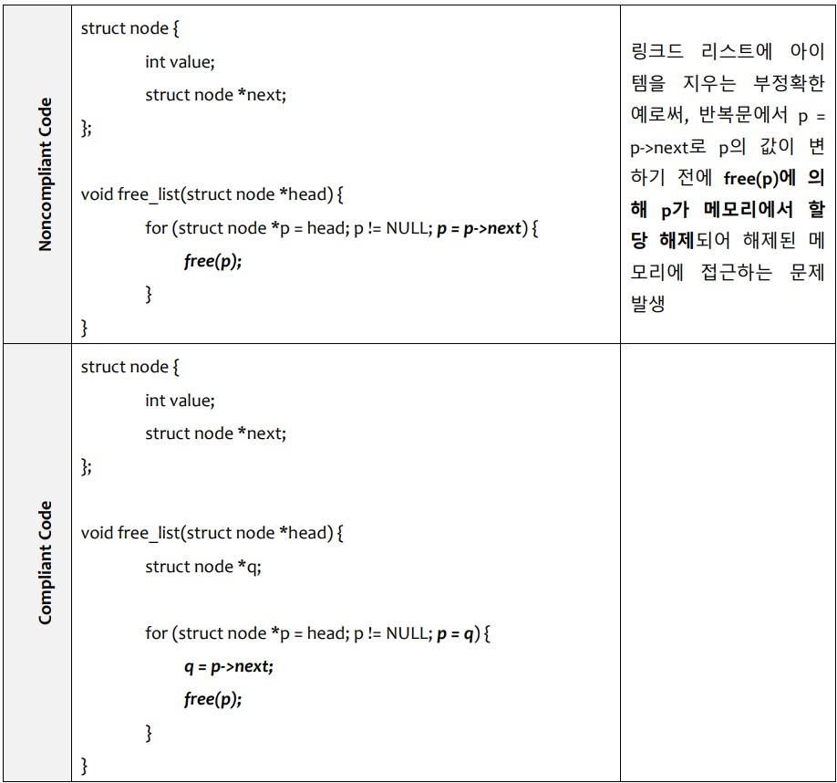 [해제된 메모리 참조 금지하는 보안코딩 규칙 예시]