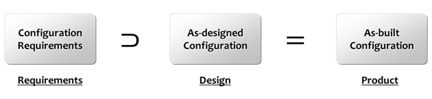한편, 완성된 설계를 구현하면 제품이 되고 실재하는 제품은 형상을 갖게 되는데 이것을 구현된 형상(as-built configuration)이라 말합니다. 이 구현된 형상은 설계된 형상과 동일하다고 인정하는 것입니다. 동일한 것이 아니고 동일하다고 인정하는 것이지요. 이 세상에 정확히 같은 형상을 가진 복수의 제품은 없습니다. 아무리 잘 만들어진 물건이라도 분자, 원자 단위로 들어가 보면 결국 차이가 있게 됩니다. 실용적인 목적 상 형상이 일치한다고 보는 것입니다.