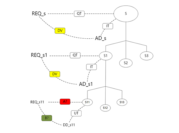 위 그림은 간단한 시스템의 계층적 분해도 입니다. 이 시스템의 계층 중간 쯤에서 하나의 일반화된 요소(구현물, Sn)를 선택해 봅니다. 무엇을 선택하든 그 요소에는 요구사항, 설계가 있고 그것들 간의 삼각관계가 있습니다. 아래 그림에서 보는 바와 같이 요구사항(Requirements) – 설계(Design) – 구현물(Sn)과 점선으로 나타난 관계들입니다.