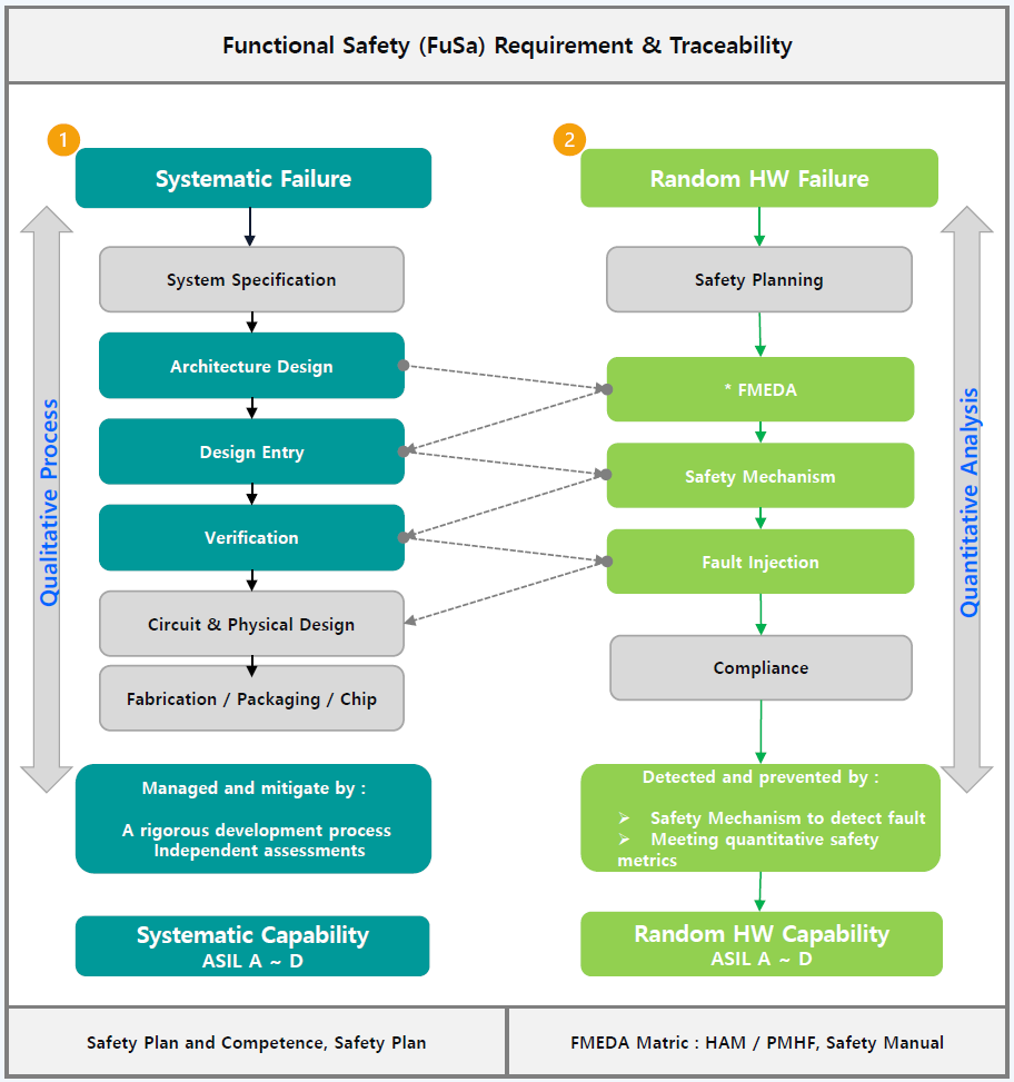ISO26262-5에서 Systematic Failure 및 Random Failure를 구분하고 각각의 대책을 세우고, Random Failure 에 대한 분석은 제품이 가지고 있는 안전 메커니즘(Safety Mechanism)에 의해 제한 시간내에 검출 및 조치를 해야 하며,