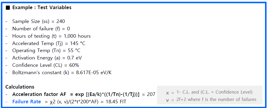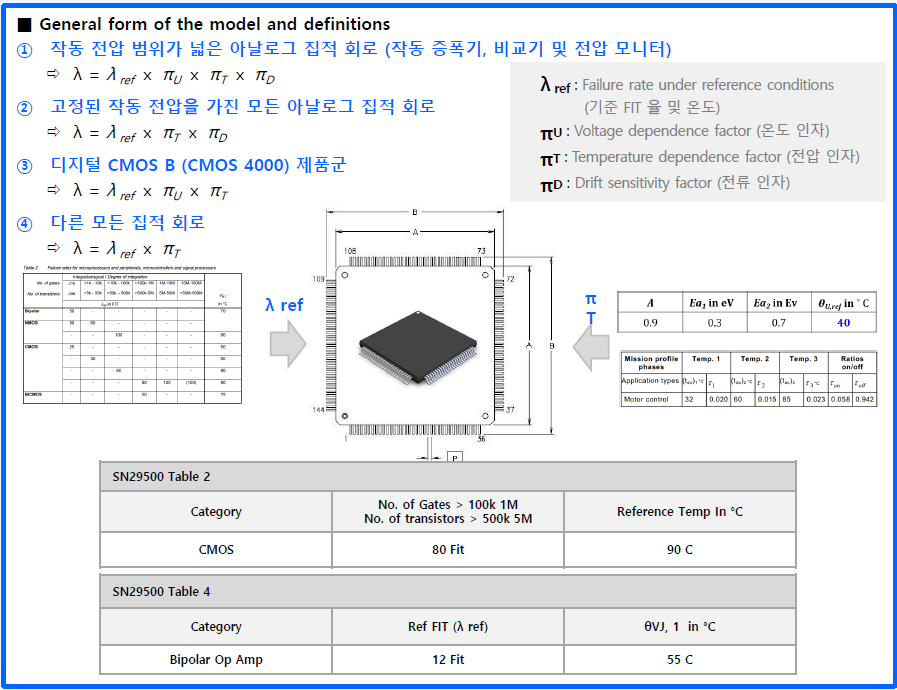 - ?die 의 고장율 공식은 IC Type 및 IC Technology, Transistor 개수, Thermal Mission Profile, Junction Temperature와 작동 및 비작동 수명에 대한 조건 포함