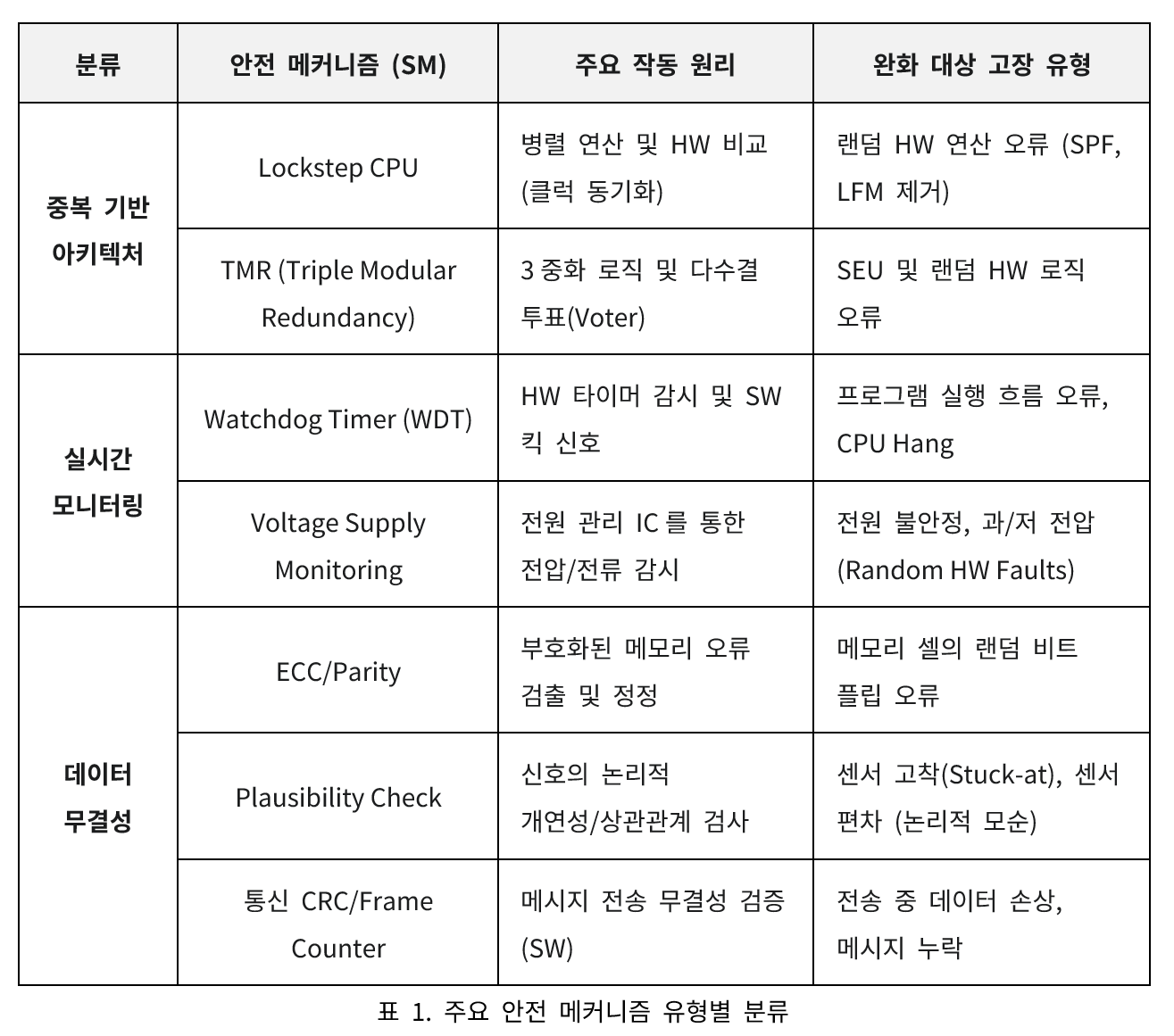 여기서는 시스템 및 하드웨어, 소프트웨어 레벨에 필요한 대표적인 안전 메커니즘(Safety Mechanism)을 기술하고자 합니다.